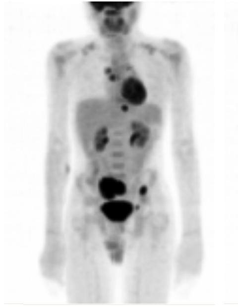 Intense FDG uptake is seen in the right hilar and mediastinal area suspicious for lymph nodes. Focally intense FDG uptake is seen in the region of the upper thoracic spine, lower thoracic spine, left iliac wing and right sacroiliac joint. Mildly intense FDG uptake is also noted in the area left of the bladder. Additionally, there is intense FDG uptake in the known sacral mass.